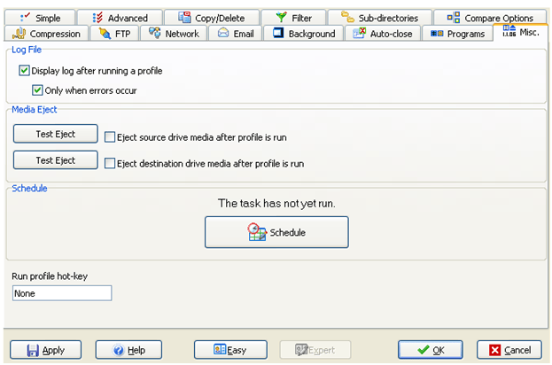 Now, as we have selected the directories, next thing we have to do is to schedule our backup on daily or weekly basis depending on our requirements. To Do this Click on Expert Tab and then Misc Tab. After that hit the button Schedule as shown in figure