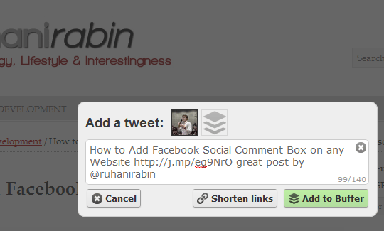 After you have created your account, adding tweets to your Buffer becomes super simple. Whenever you are on a page you find interesting, hit the Buffer icon. This is what happens after I click it by reading one of Ruhani’s posts:
