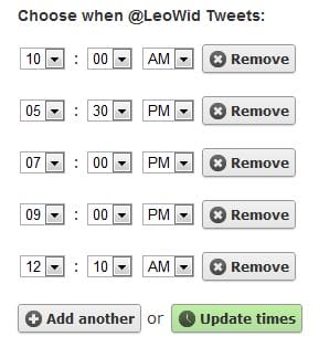 By default Buffer will send out your Tweets at Peak times during the day. Of course you can always go back to your Settings and change these fixed daily tweeting times. You can add more, delete some or change them for your needs. Here are mine