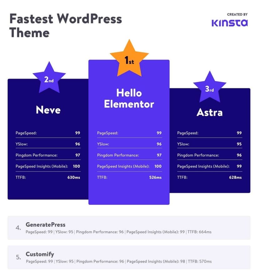 While hosting plays a big role in performance. It is also similarly important to use a highly optimized WordPress theme. The high-performing WordPress themes have less bloat and give you a pure speed boost for optimal SEO ranking. Here are a few top-notch ones, ranked by performance (Kinsta did the full testing on their performance).